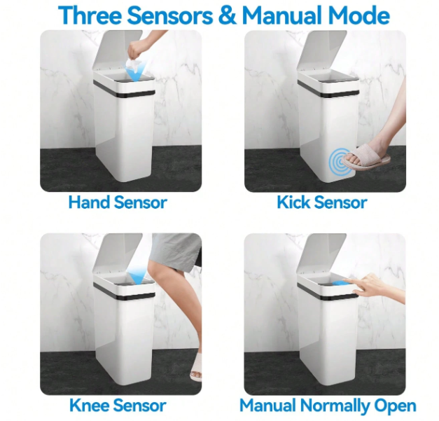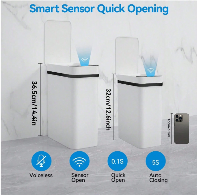 Upgrade your space with this automatic touchless sensor trash can, designed for convenient and hygienic waste disposal. The smart motion sensor technology allows the lid to open automatically with a simple hand movement, helping reduce contact and maintain better cleanliness. Its slim and narrow design makes it ideal for small spaces such as kitchens, bathrooms, bedrooms, offices, and RVs.